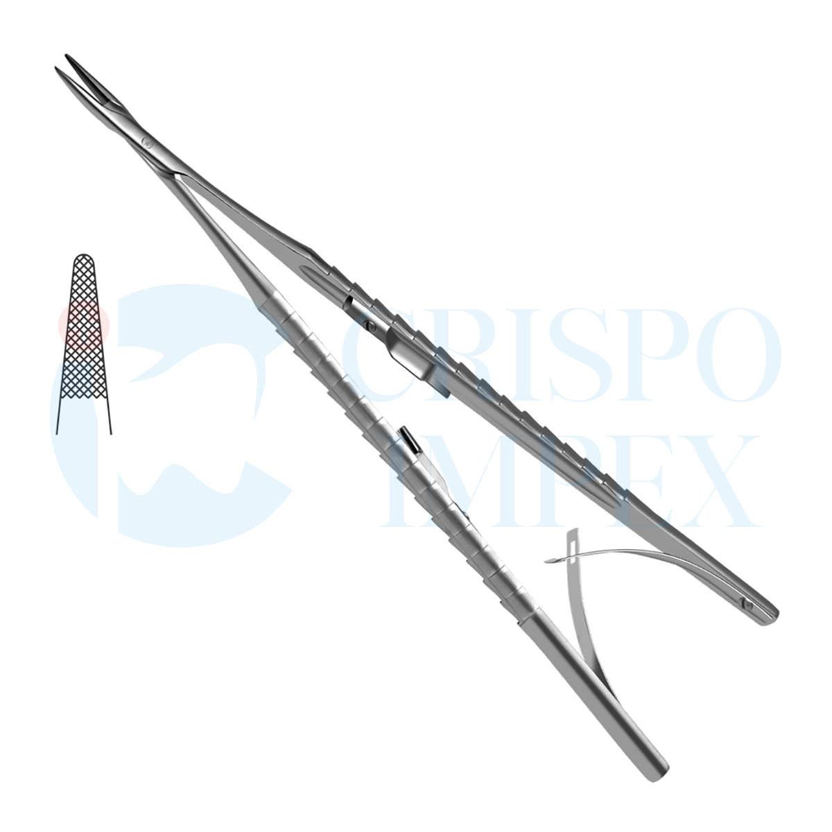 Also referred to as castroviejo micro forceps, these dental needle holders, regardless of any handle size, come with a Tapered tip all the way to the top making it ideal for fine delicate surgical procedures. At Crispo you can also find Straight Tip Castroviejo Needle Holder featuring similar handling characteristics but with a vertically straight tip.